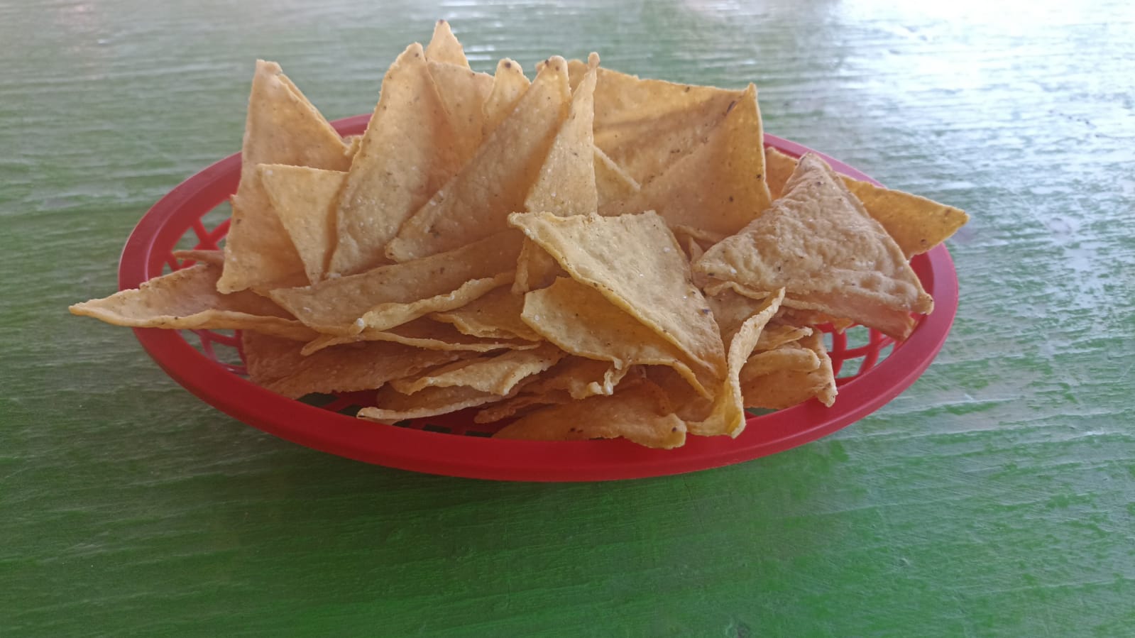 2 tostadas de carne con frijol acompañadas con su vaso de agua del dia