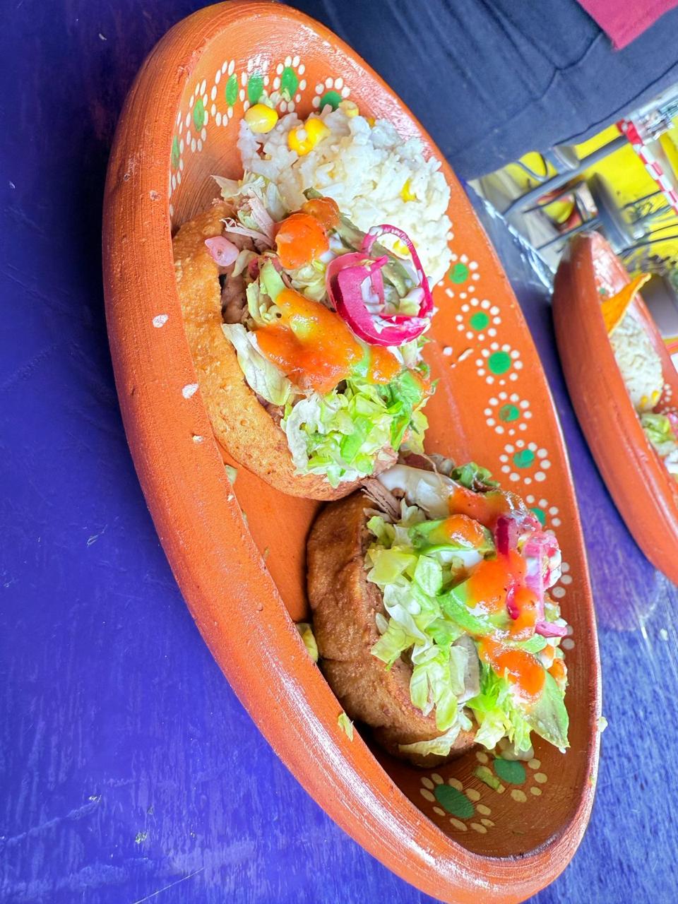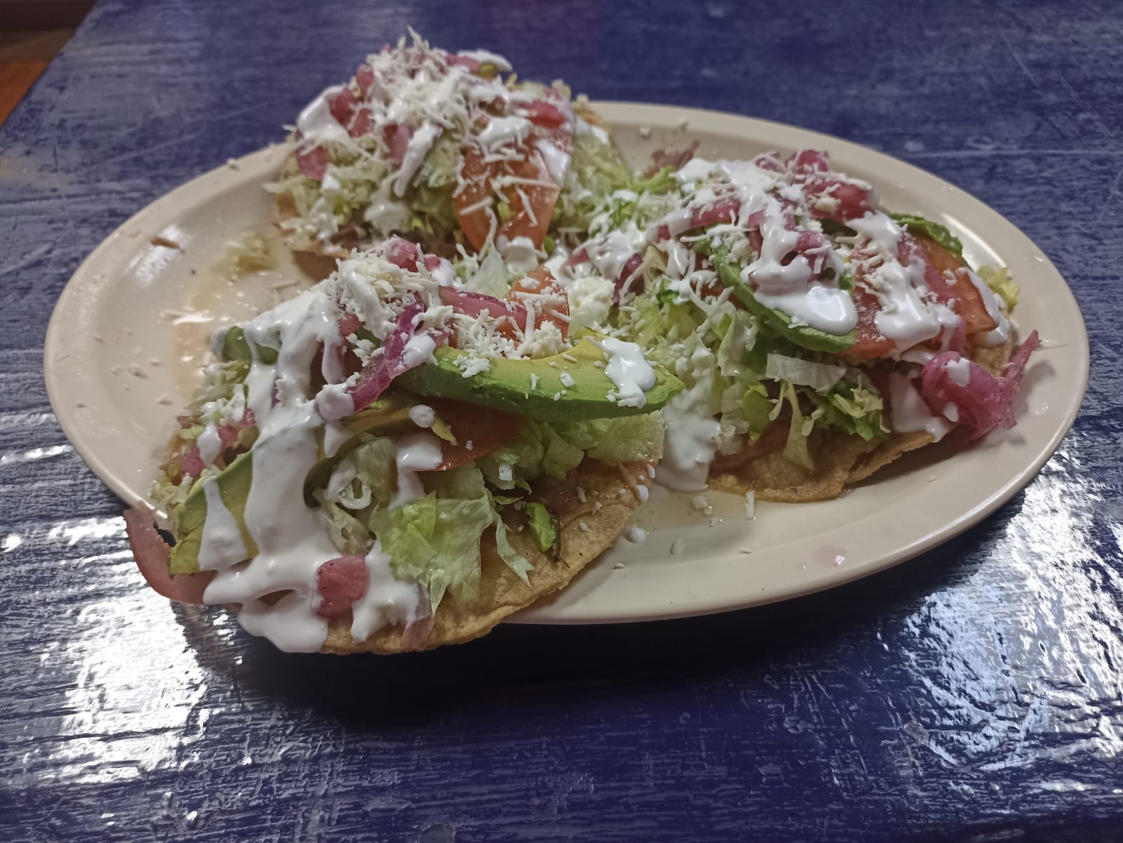 2 sopes con carne y frijol encima lechuga, consome de tomate, aguacate, cebolla morada y su vaso de agua del dia