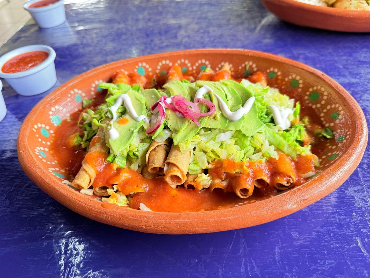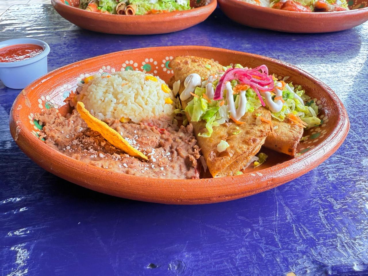 2 chimichangas rellenas de queso y carne en tortilla de harina bañada de lechuga, consome de tomate, crema, aguacate. Con su agua fresca del dia, acompañada de arroz y frijol
