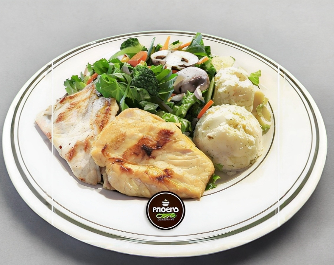 Deliciosa pechuga de pollo a la plancha, ensalsa con espinaca, lechuga romana, tomate, zanahoria, rallada, brócoli, champiñones frescos, aderezo al gusto y un puré de papa de la casa.