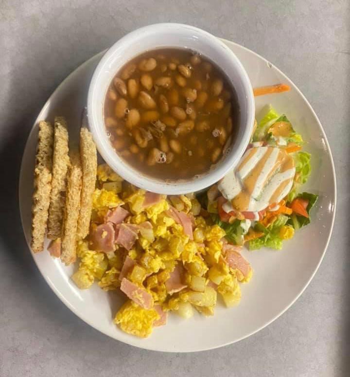 Como en casa, huevos revueltos, con papa y jamón. Acompañados de frijoles de la olla.