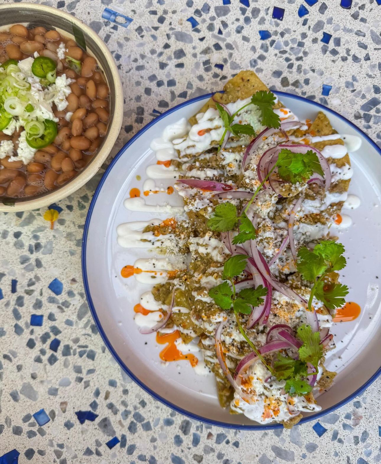 Chilaquiles verdes con chicharrón prensado con crema, queso, cebolla,cilantro y frijoles