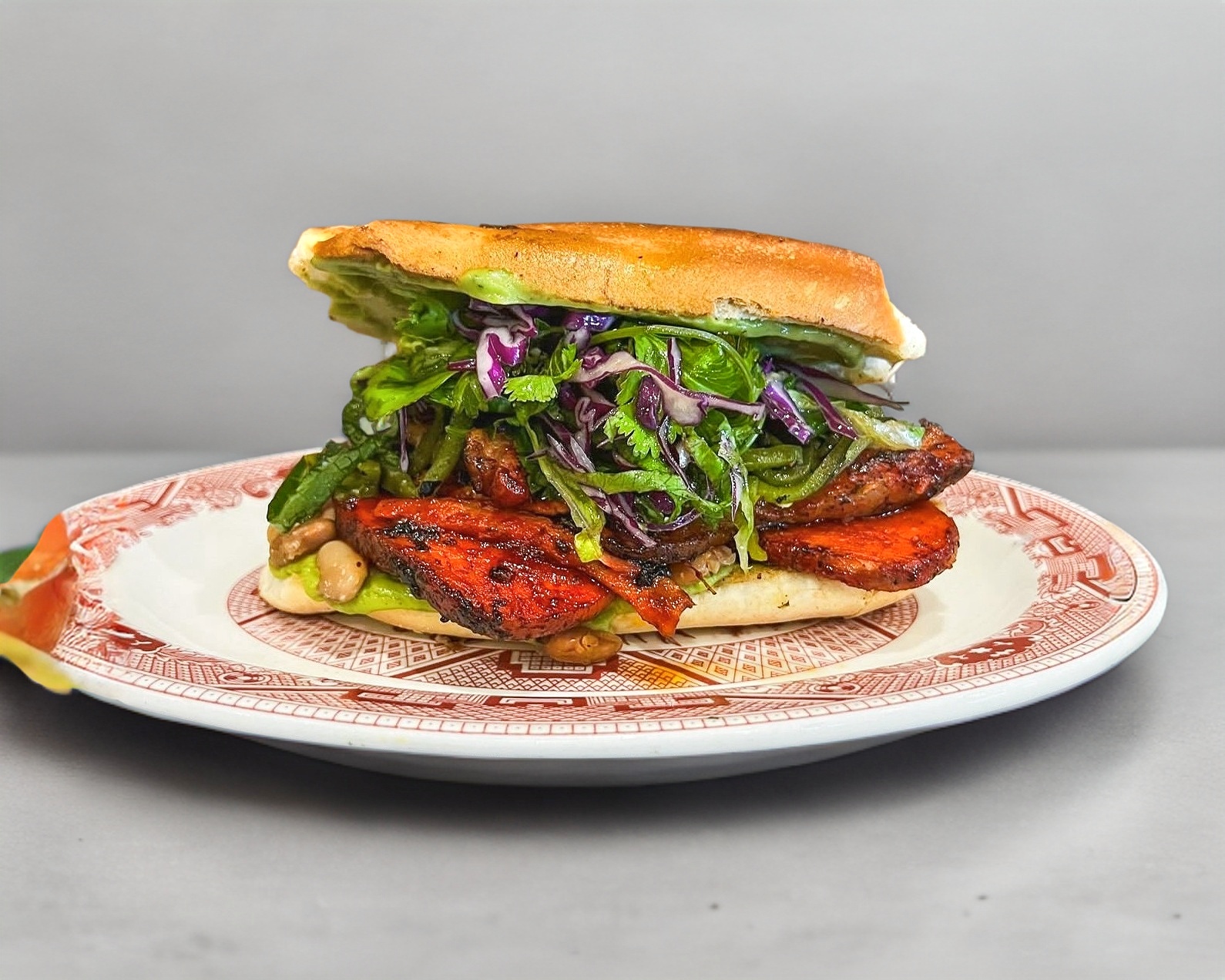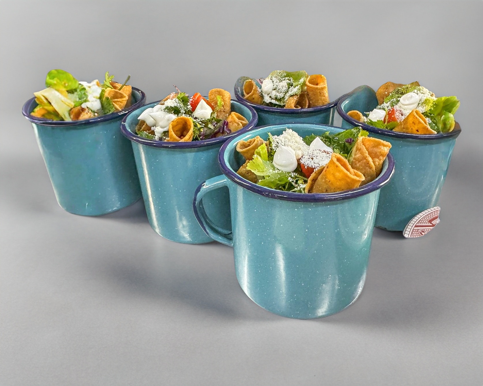 Calnitas coloradas estilo chino, rellena con frijoles, guacamole, chile tatemado y mix de lechugas.