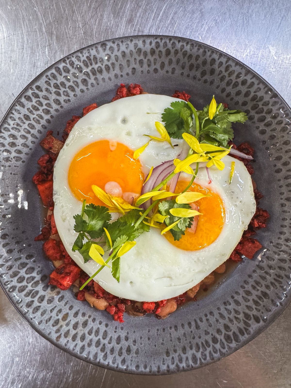 Acompañada de una pieza de huevo con crema, queso, cebolla y cilantro.