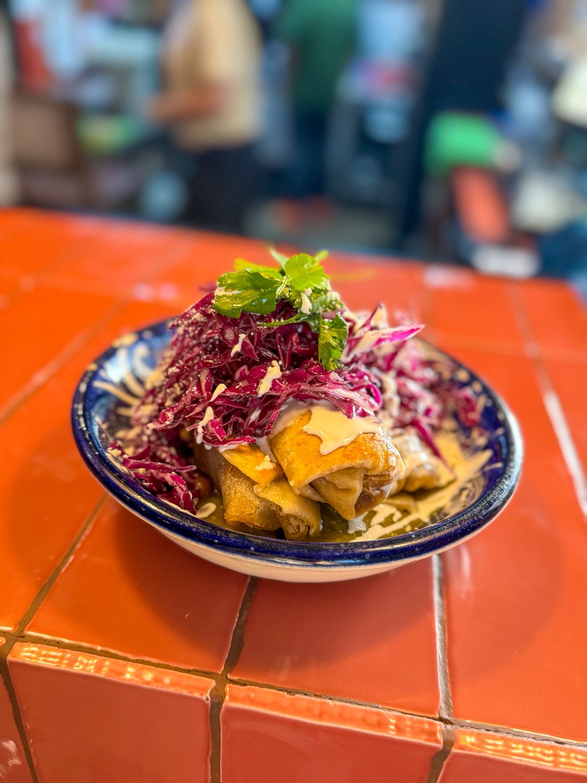 5 flautas con frijoles, guacamole,salsa , queso cotija y crema.