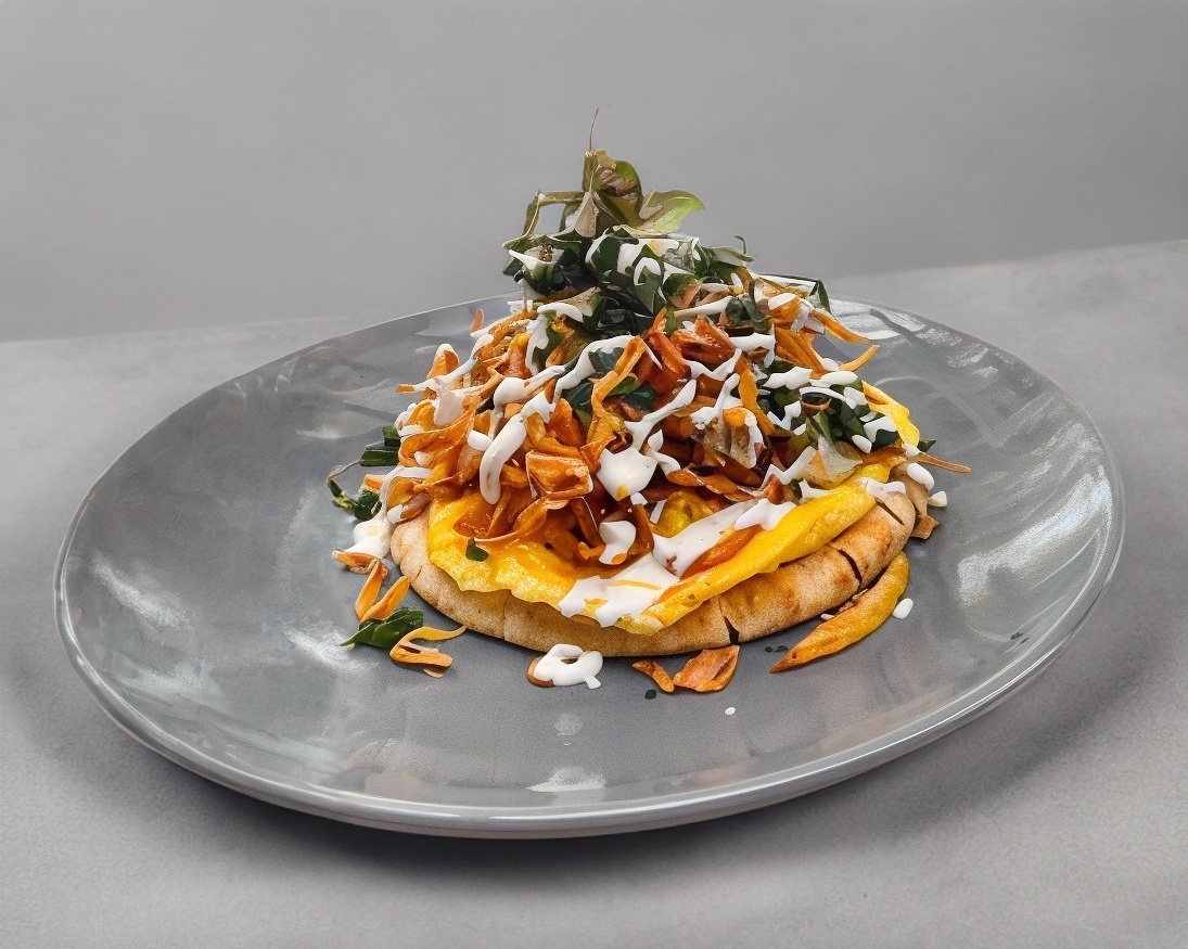 Pan pitacon crema siracha, huevo rev con tocino, cebolla frita y queso fresco