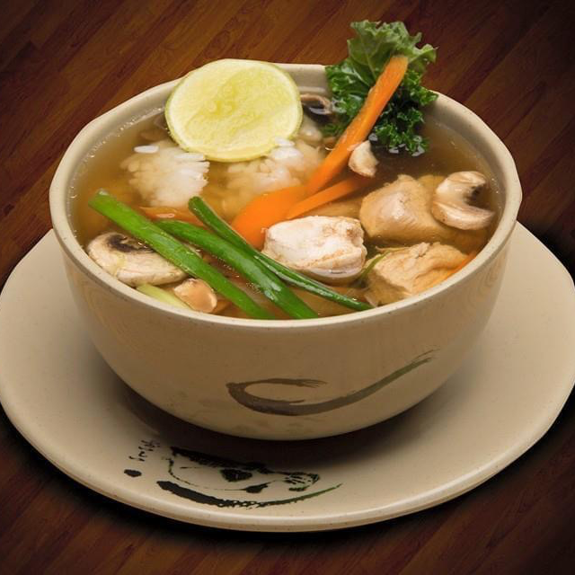 Sopa de pollo con cebollin, zanahoria, champiñon, espinaca y arroz.