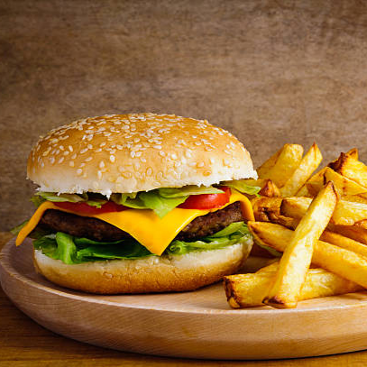Hamburguesa de carne de res con queso americano, lechuga, tomate, cebolla. Acompañadas de papas fritas y refresco coca cola