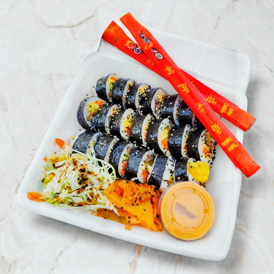 Charola de Sushi Coreano de Res (Bulgogi), Nabo, Zanahoria, huevo y pepino. Todos los rollos incluyen alga. Sazonado al estilo coreano. Acompanado de kimchi y ensalada.