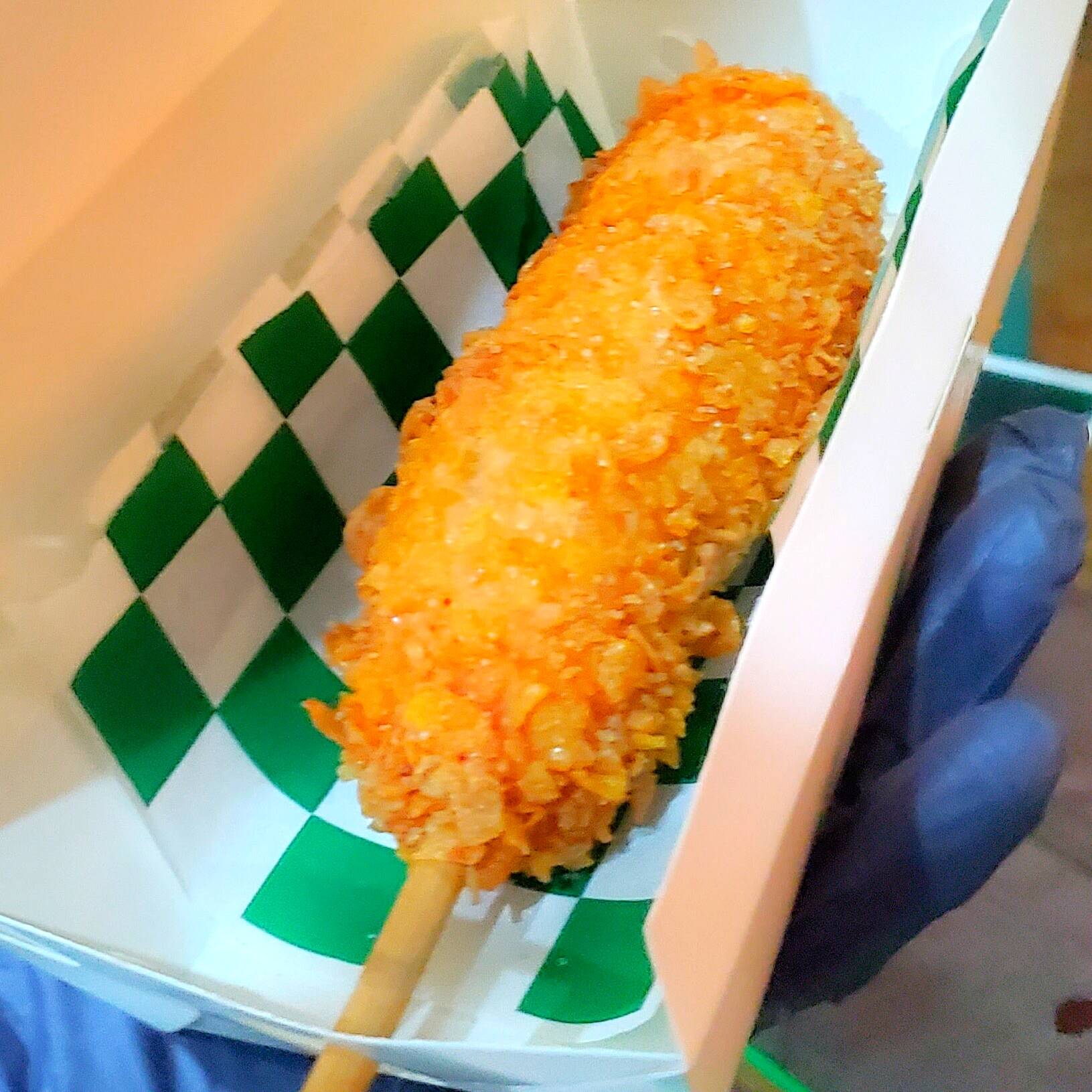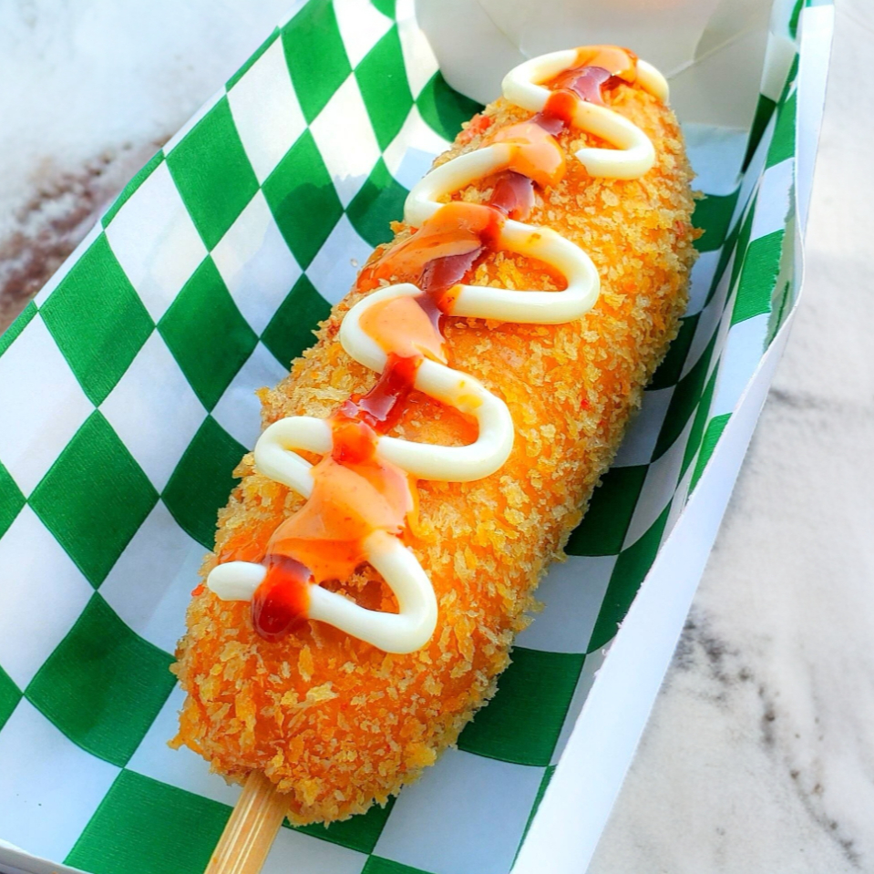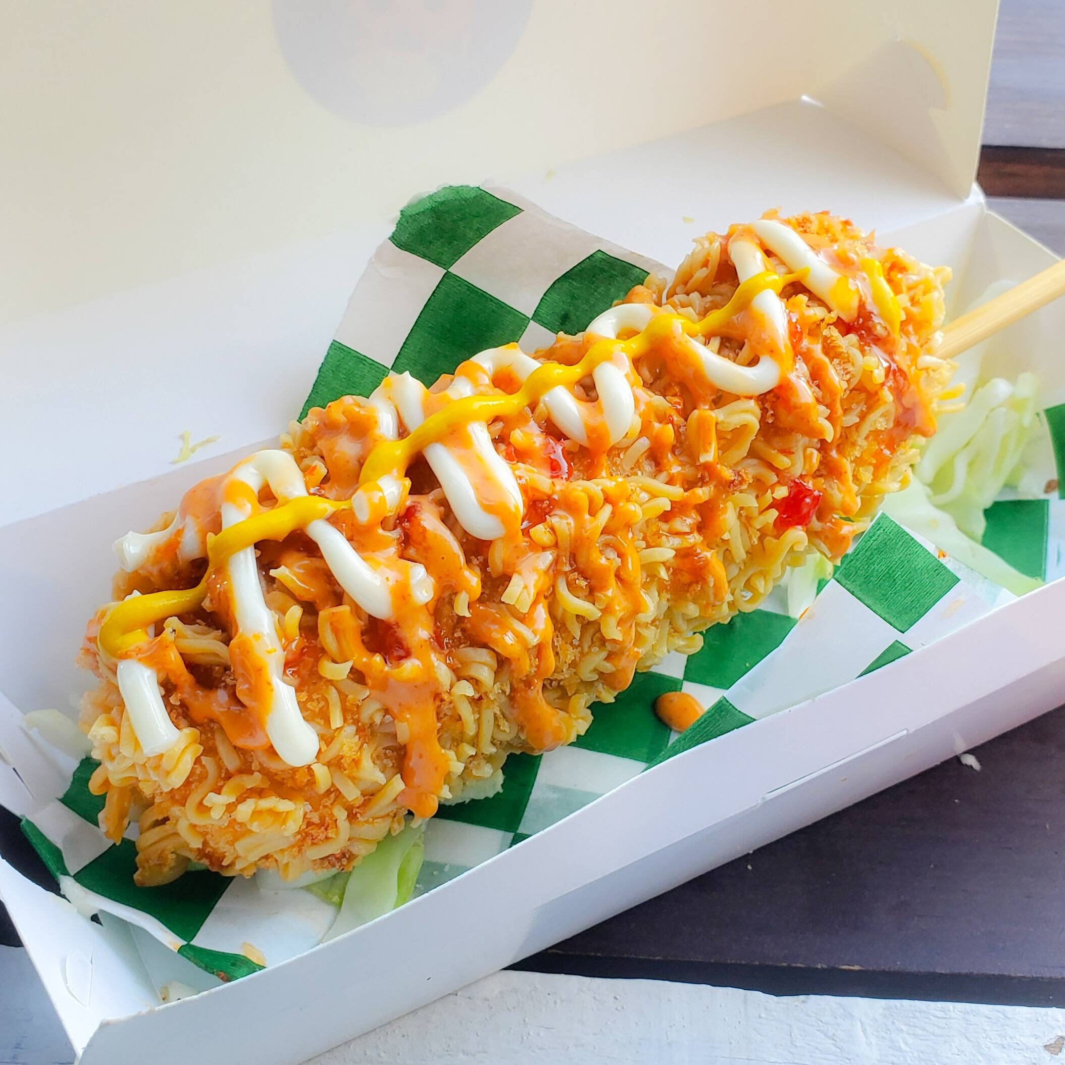 Banderilla Extra-Crujiente con Ramen, mitad queso motzarella, mitad salchicha ahumada premium