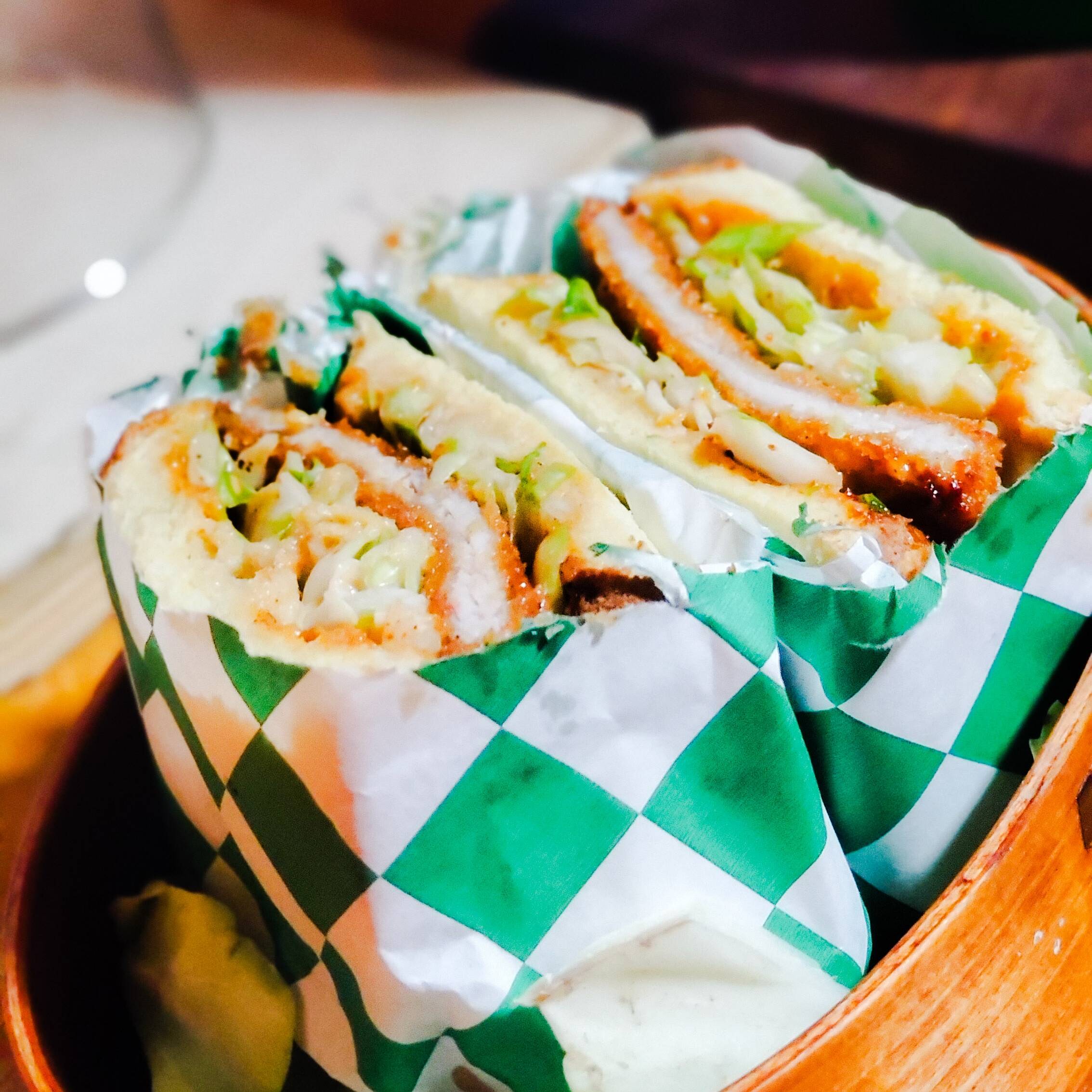 Sandwish con pan esponjoso con mantequilla, corte de puerco sin grasa. empanizado con panko, ensalada de repollo coreana, salsa gochujang y agridulce.