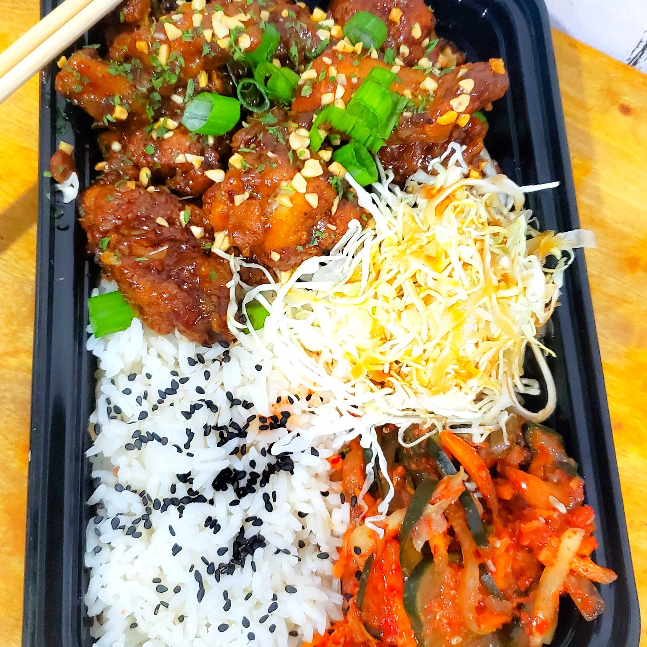 Plato con Arroz blanco de calidad, Kimchi fresco, Repollo en salsa coreana y pollo frito Coreano con salsa Ganjang (Salsa de soja y cacahuate)