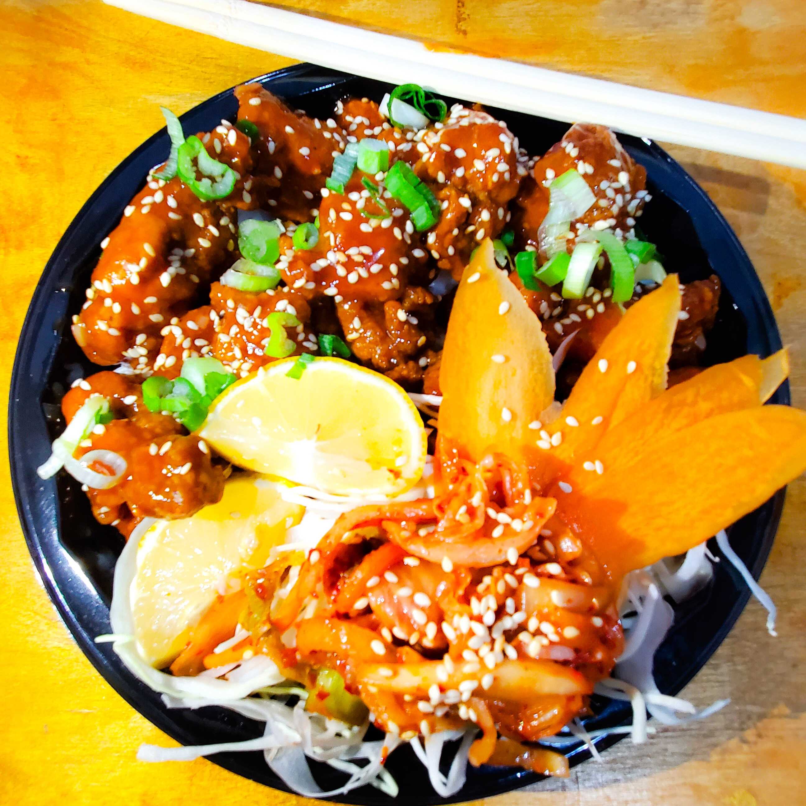 Charola de pollo frito coreano, con arroz, aderezos, kimchi y 2 Te de Jazmin.