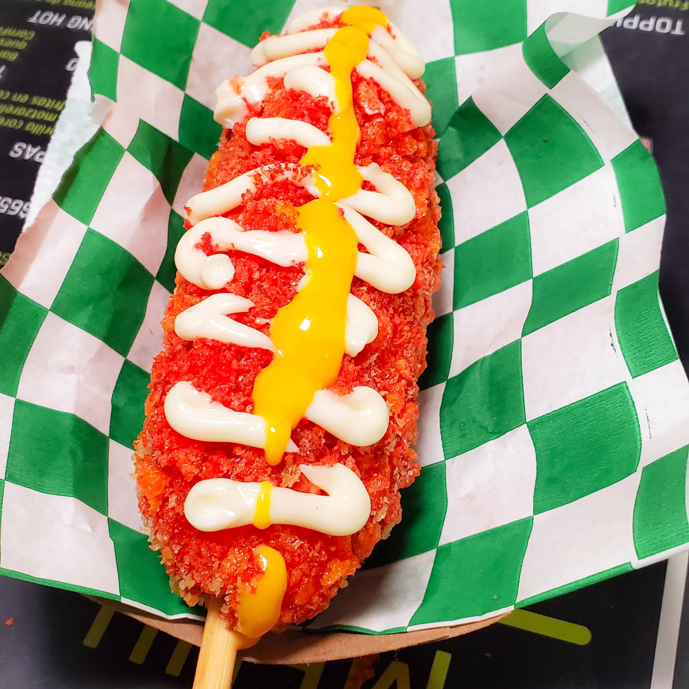 Banderilla Fusion con cheetos flamming Hot, mitad queso motzarella, mitad salchicha ahumada premium