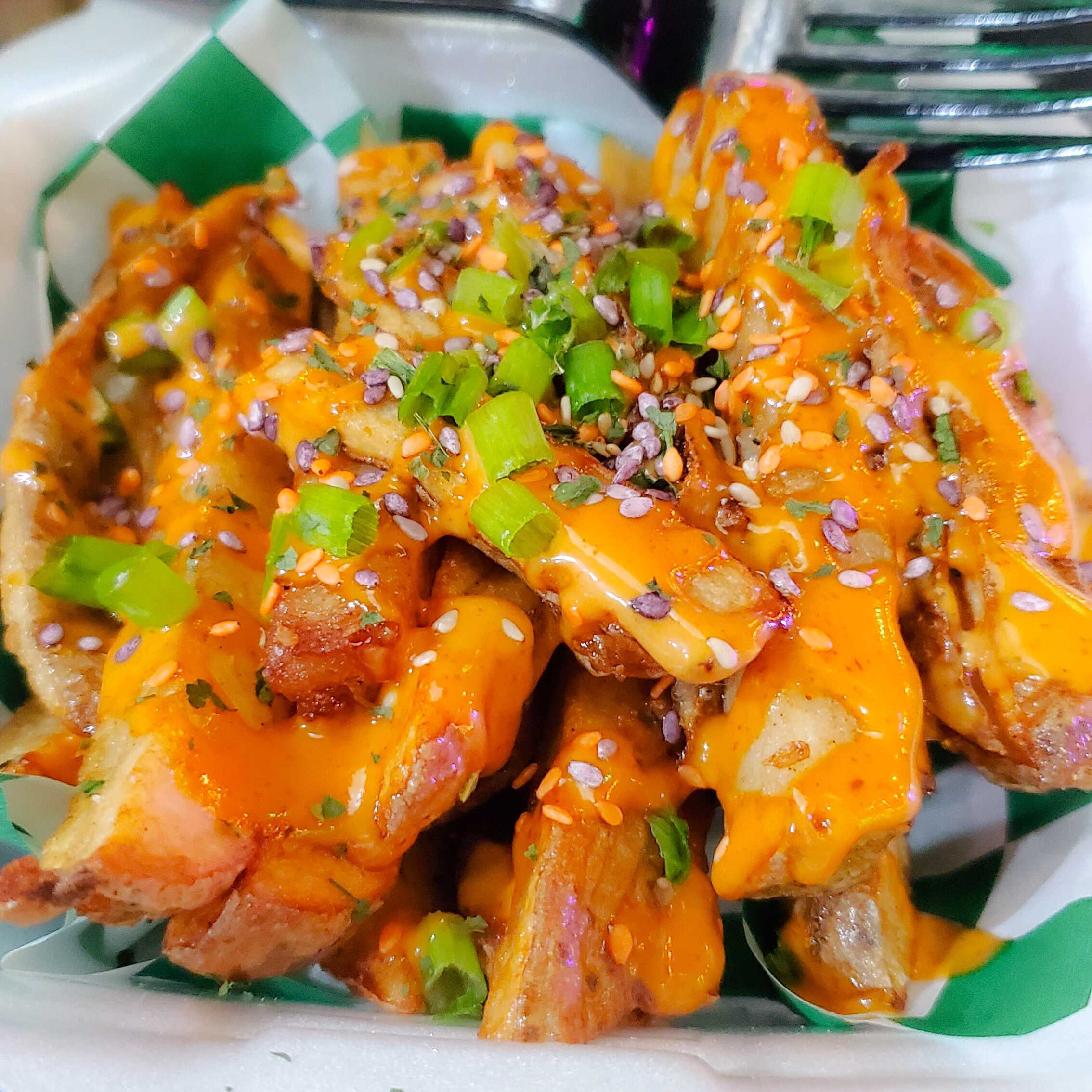 Papas fritas sazonadas. adedrezadas con salsa secreta corea, chiles gochujang, ajonjoli, cebollin.