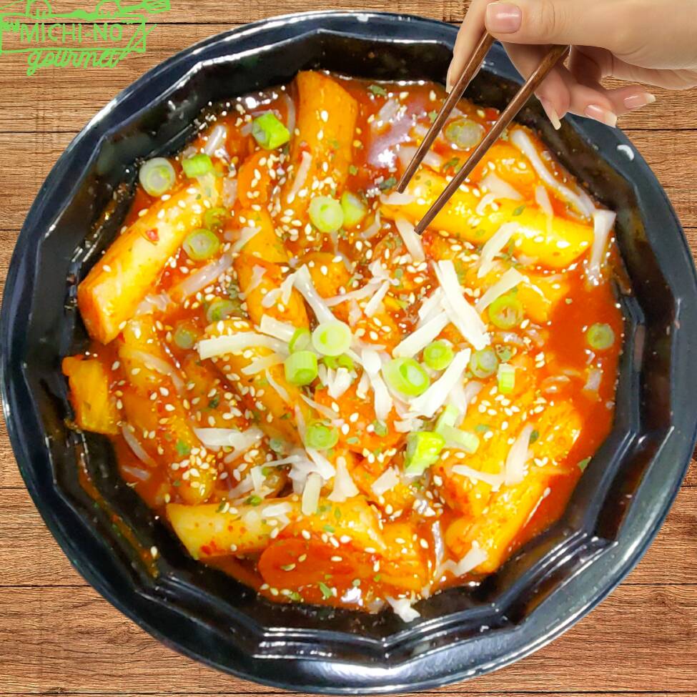 Trozos de pastel de arroz en una salsa de reduccion de verduras, especias, Gocchugaru y Gochujang. un golpe umami de sabor. Dulce, picoso y salado. con una textura exquisita.