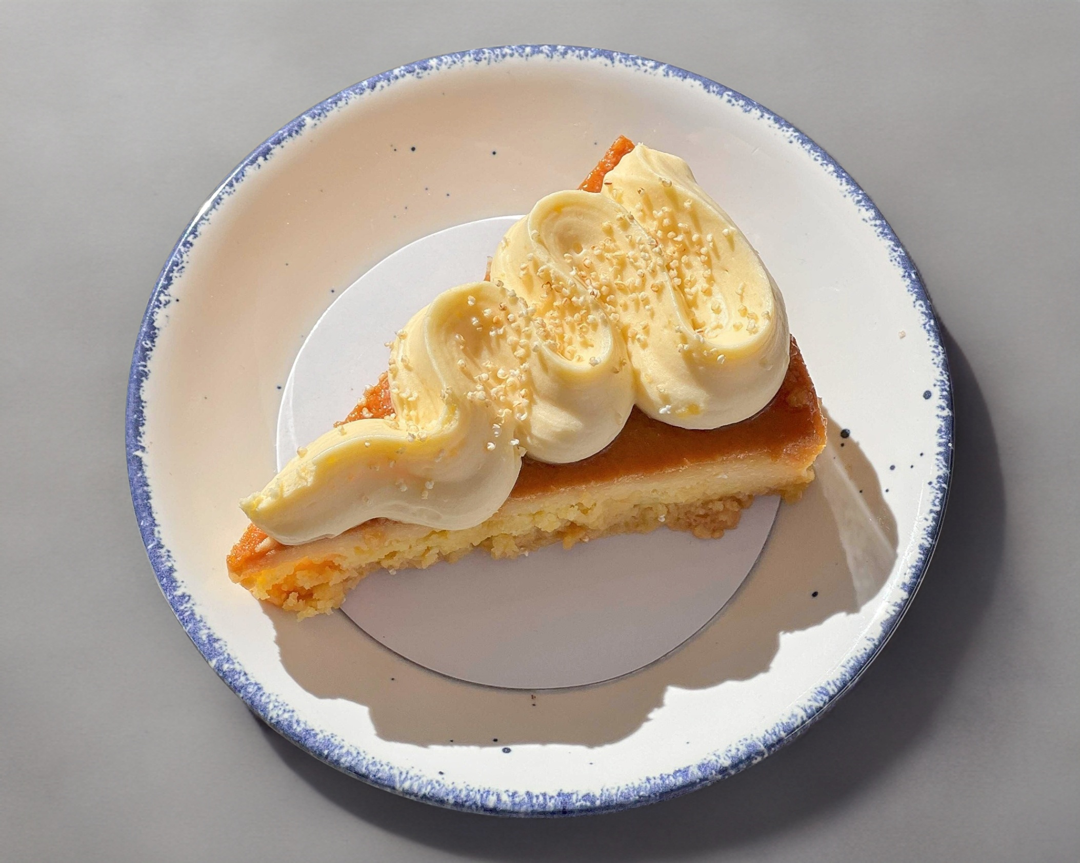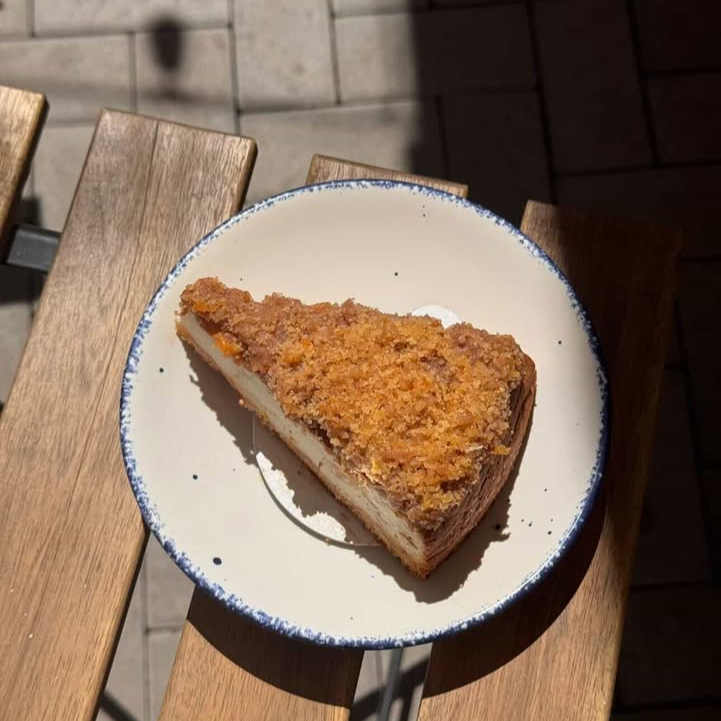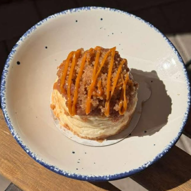 Cheesecake cremoso cubierto con compota de manzana, crumble de nuez y toque de caramelo salado.