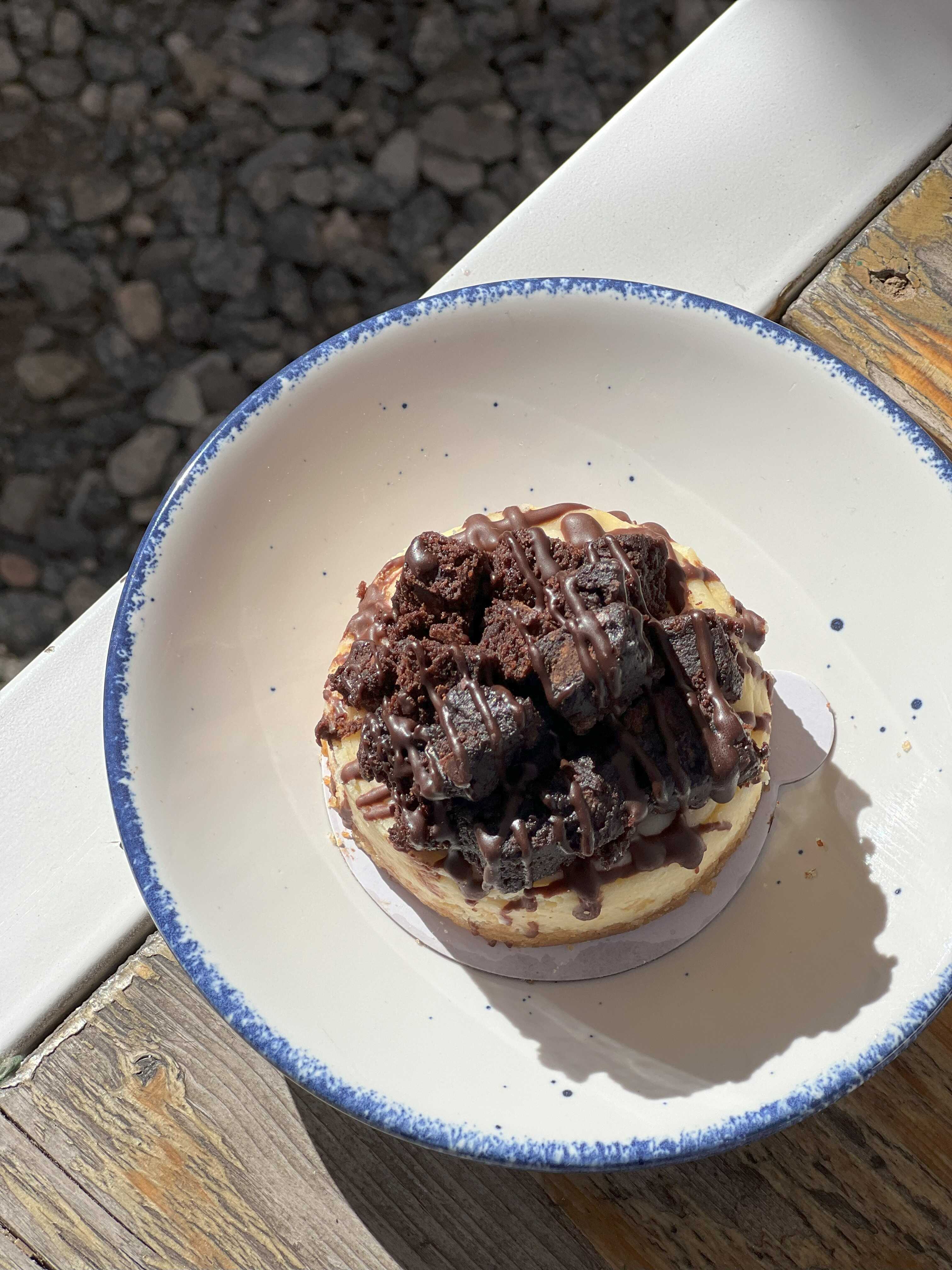 Cheesecake cremoso cubierto con trozos de brownie y ganache de chocolate.
