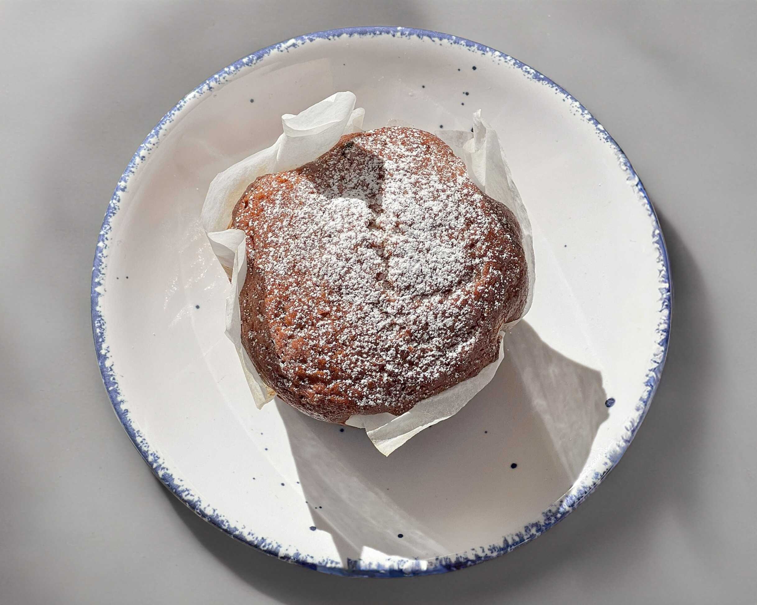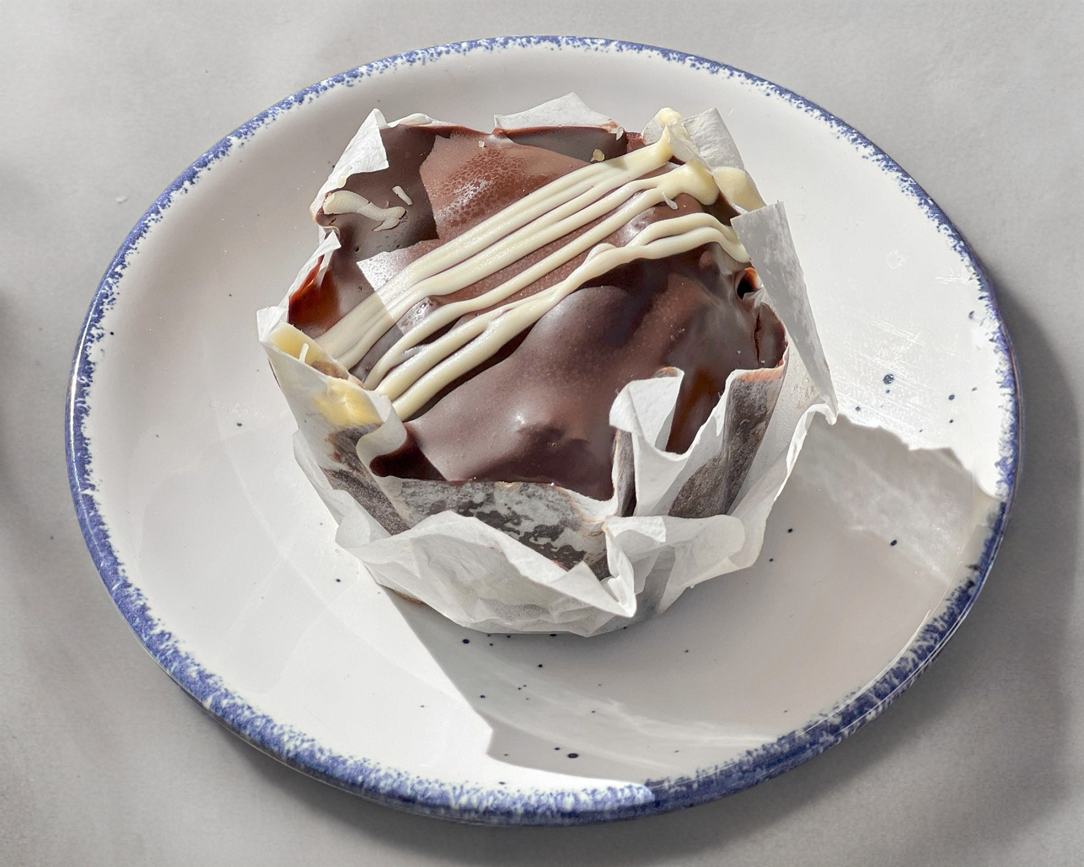 Muffin de chocolate relleno de crema de vainilla cubierto con ganache de chocolate.