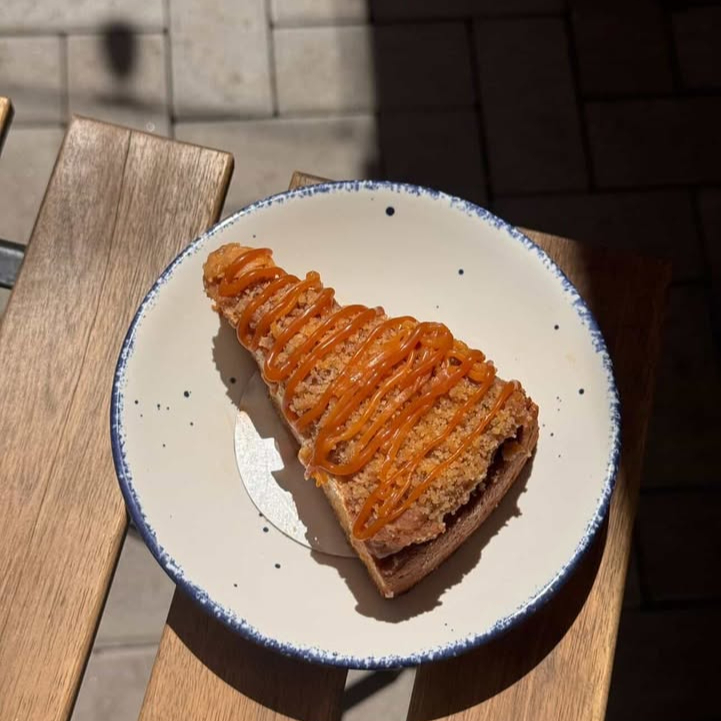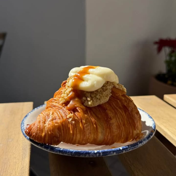 Croissant relleno de compota de manzana cubierto con caramelo.