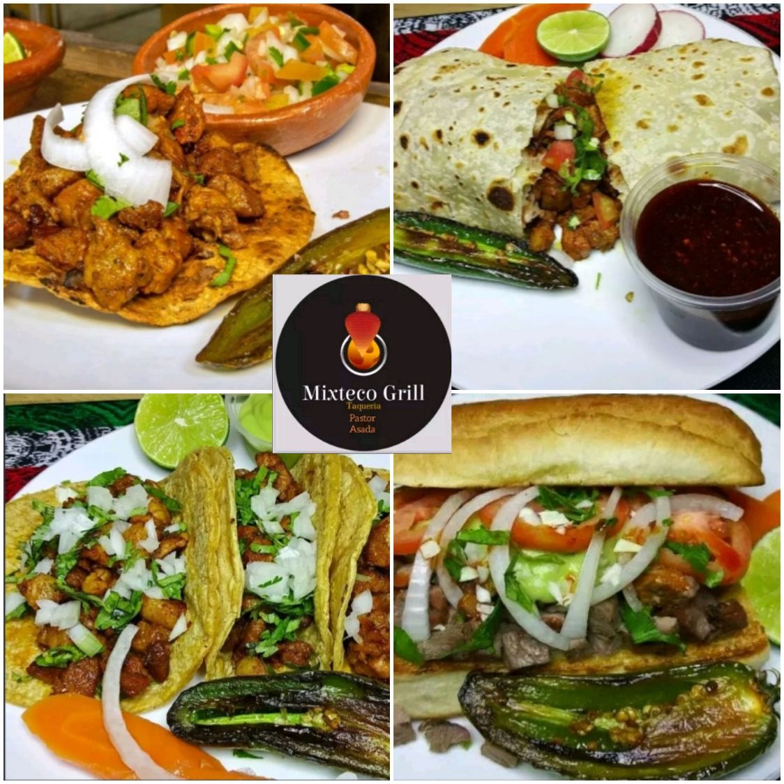 Carne asada, carne al pastor, frijol de la olla, queso gratinado y su guarnición.