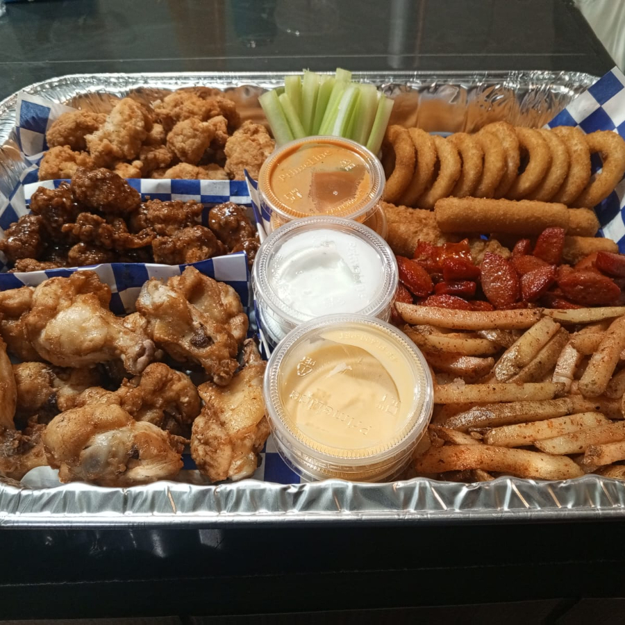 CHAROLA FAMILIAR PARA 4-6 PERSONAS CON BONELESS DOS SABORES , WINGS , BUBAS, AROS DE CEBOLLA, DEDOS DE QUESO , PAPAS FRITAS , ADEREZOS, ALGO BIEN LA CHORALA!!!