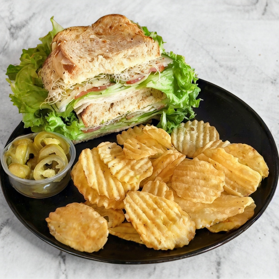 Pan Integral 12 Granos, Jamón de Pavo, Queso Americano, Lechuga, Tomate, Germinado de Alfalfa, Pepino, Aguacate y Mayonesa. Acompañado de papitas saladas y la bebida de tu elección.