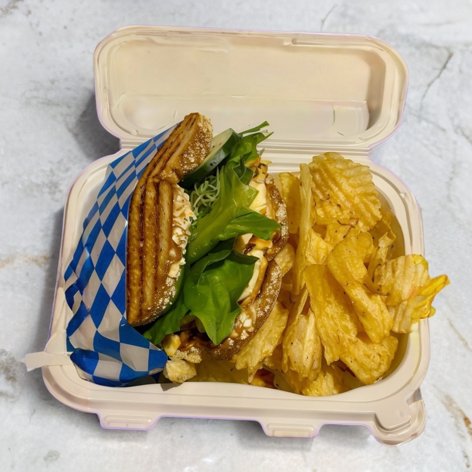 Sándwich de Pechuga de Pollo marinada en una mezcla de tres salsas picositas cocinada a la plancha, Queso Manchego, Lechuga, Tomate, Germinado de Alfalfa, Pepino, Aguacate y Mayonesa. Acompañada de papitas saladas y la bebida de tu elección