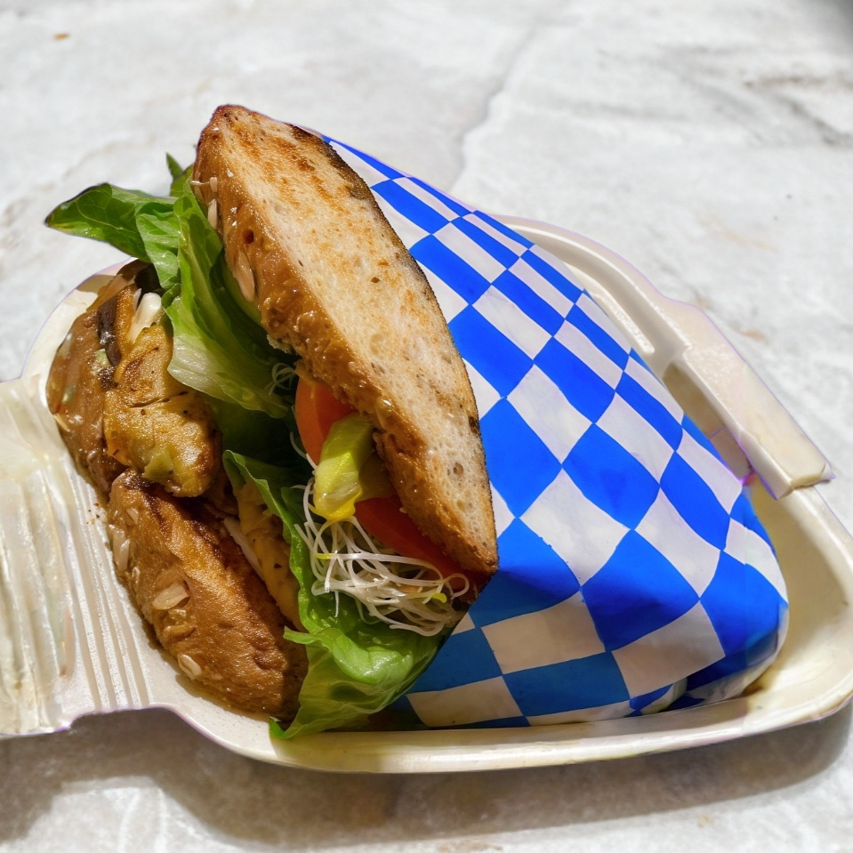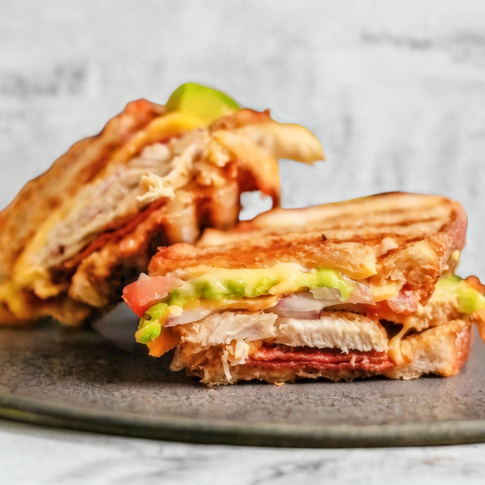 Pan Integral 12 Granos, Pechuga de Pollo marinada en una mezcla de tres salsas picositas cocinada a la plancha, Queso Manchego, Lechuga, Tomate, Germinado de Alfalfa, Pepino, Aguacate y Mayonesa.