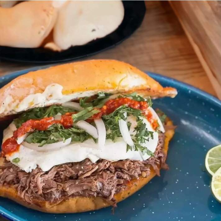 Pan salseada y dorado con porción de chilaquiles bañados en salsa de la casa acompañados de barbacoa, queso y huevo montado.