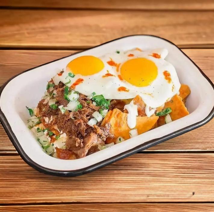 Totopos fritos bañados en salsa chilaquil de la casa, acompañados de huevito al gusto y porción de carne de barbacoa de res.