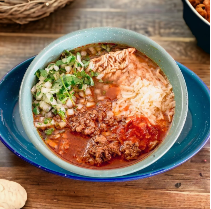 Vaso de 3/4 de litro con pasta ramen previamente cocida en consomé de res, acompañada de carne barbacoa y queso.