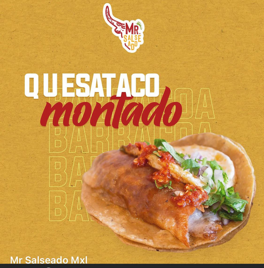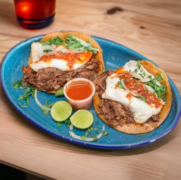 Taco de barbacoa de res en tortilla salseada y huevito montado.