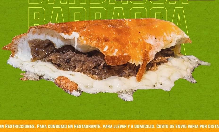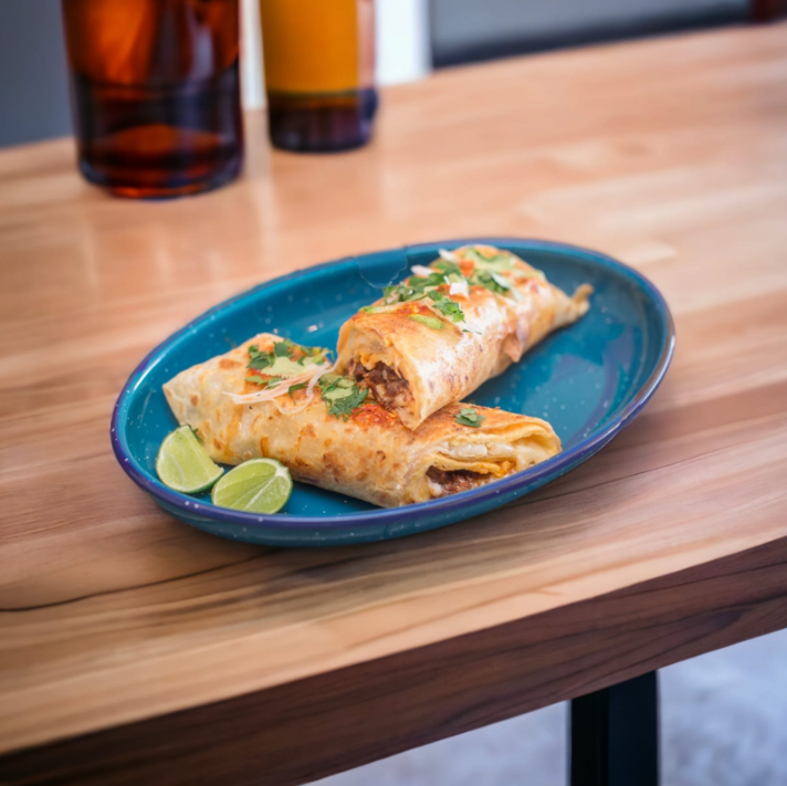 Burro de tortilla de harina de 14" salseada y dorada, con 300 gr de carne barbacoa, con queso.