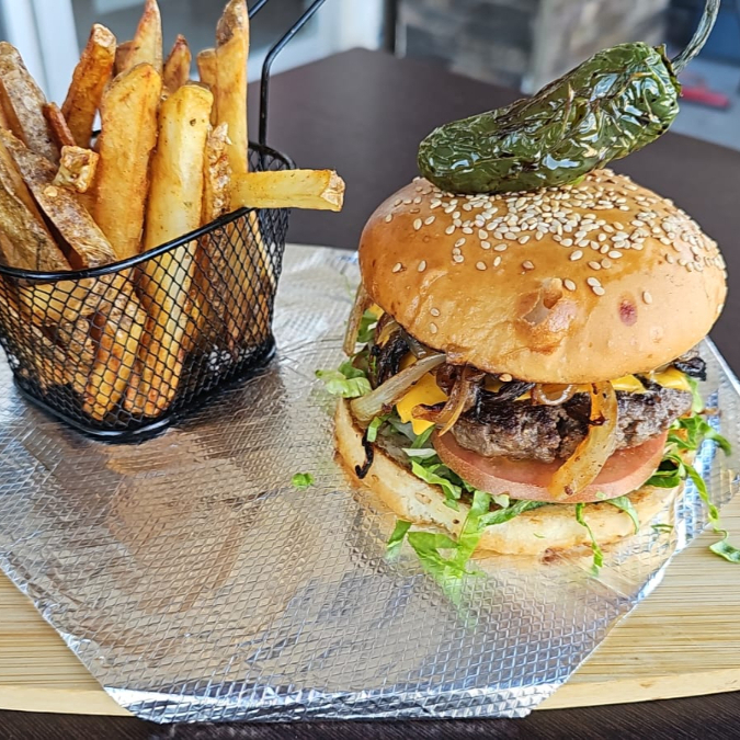Jugosa carne de res a la parrilla con queso fundido, lechuga fresca, tomate y cebolla en pan artesanal.