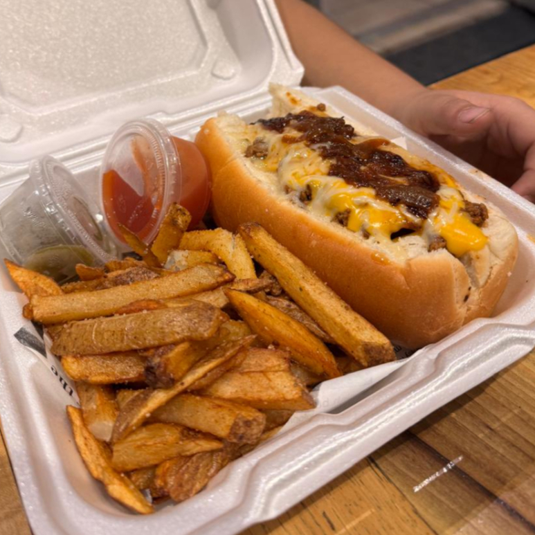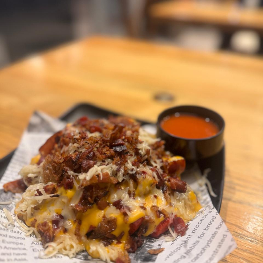 Papas fritas premium cubiertas con trozos de tocino crujiente, queso fundido y chili beans.