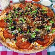 Queso mozzarella, pepperoni, salchicha italiana , morrón, aceituna negra y champiñón