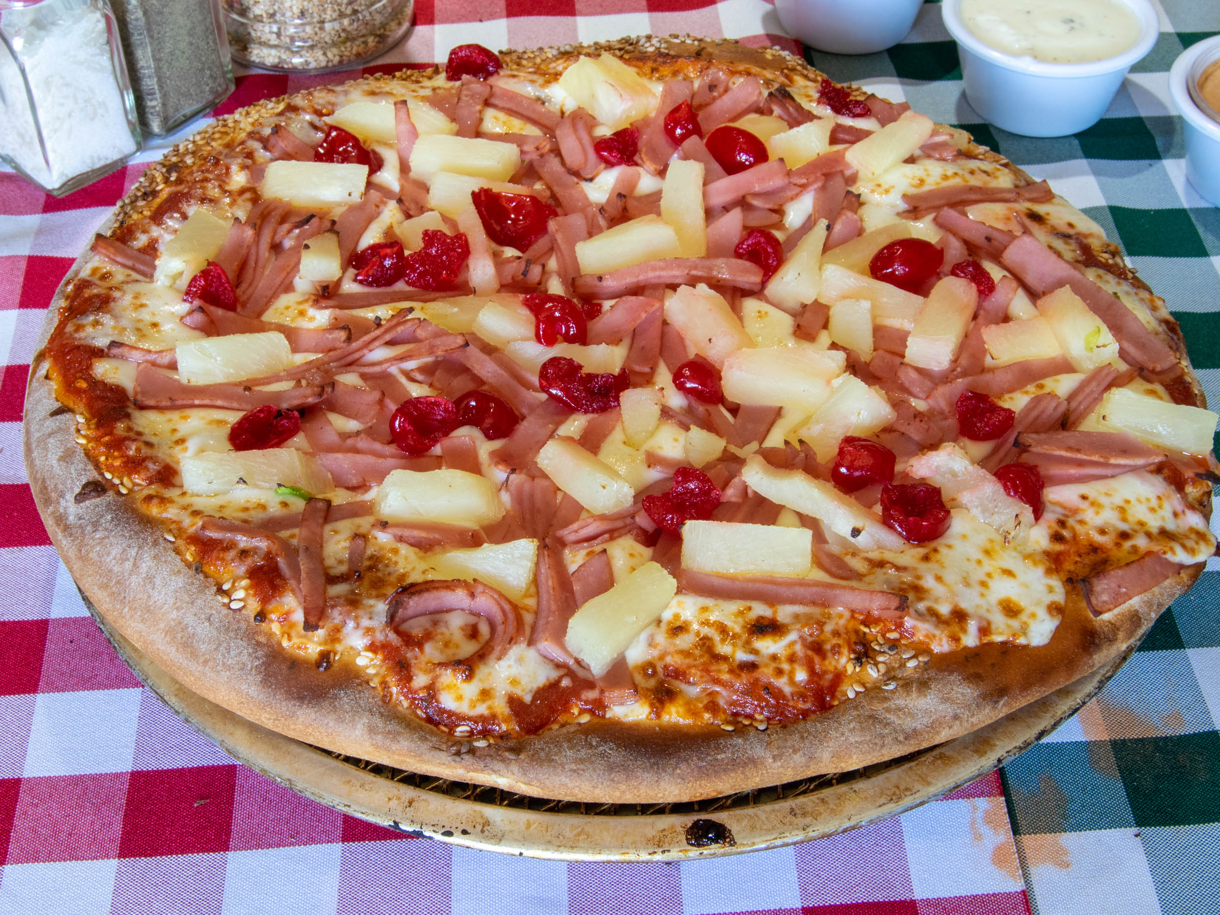 Queso mozzarella, pepperoni, jamón, tocino y morrón