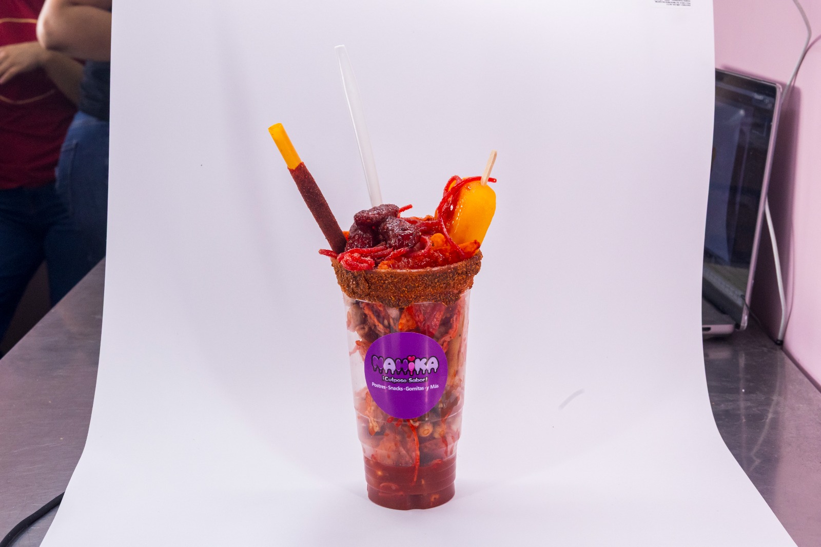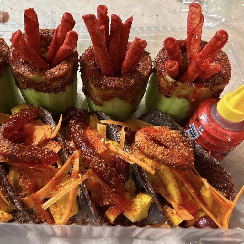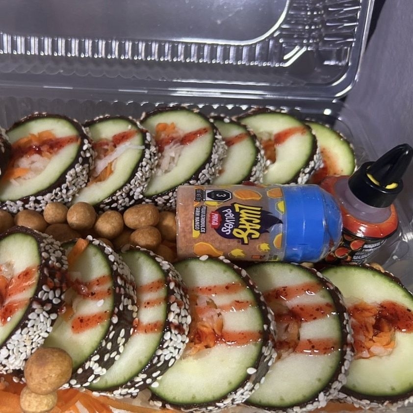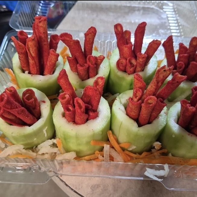 Pepino preparado con takis y salsas.