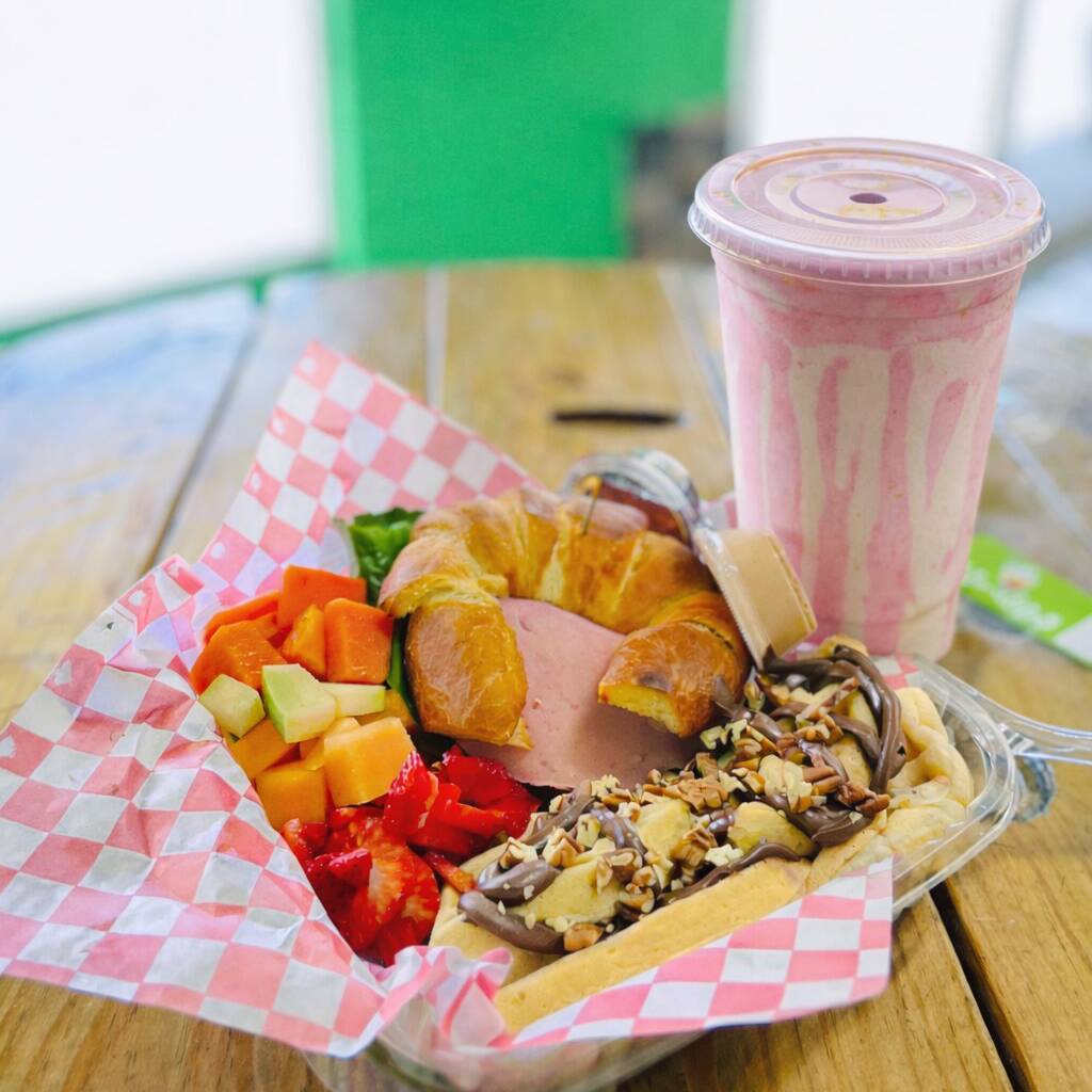 Papaya, plátano, fresa, melón, pera, manzana roja, manzana verde, piña, lechera, jugo de naranja, pasas, arándano, ralladura de coco y miel.