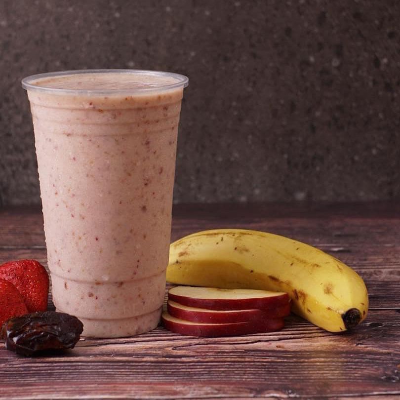 Manzana roja, fresa, plátano, vainilla, canela, leche o sustituto.
