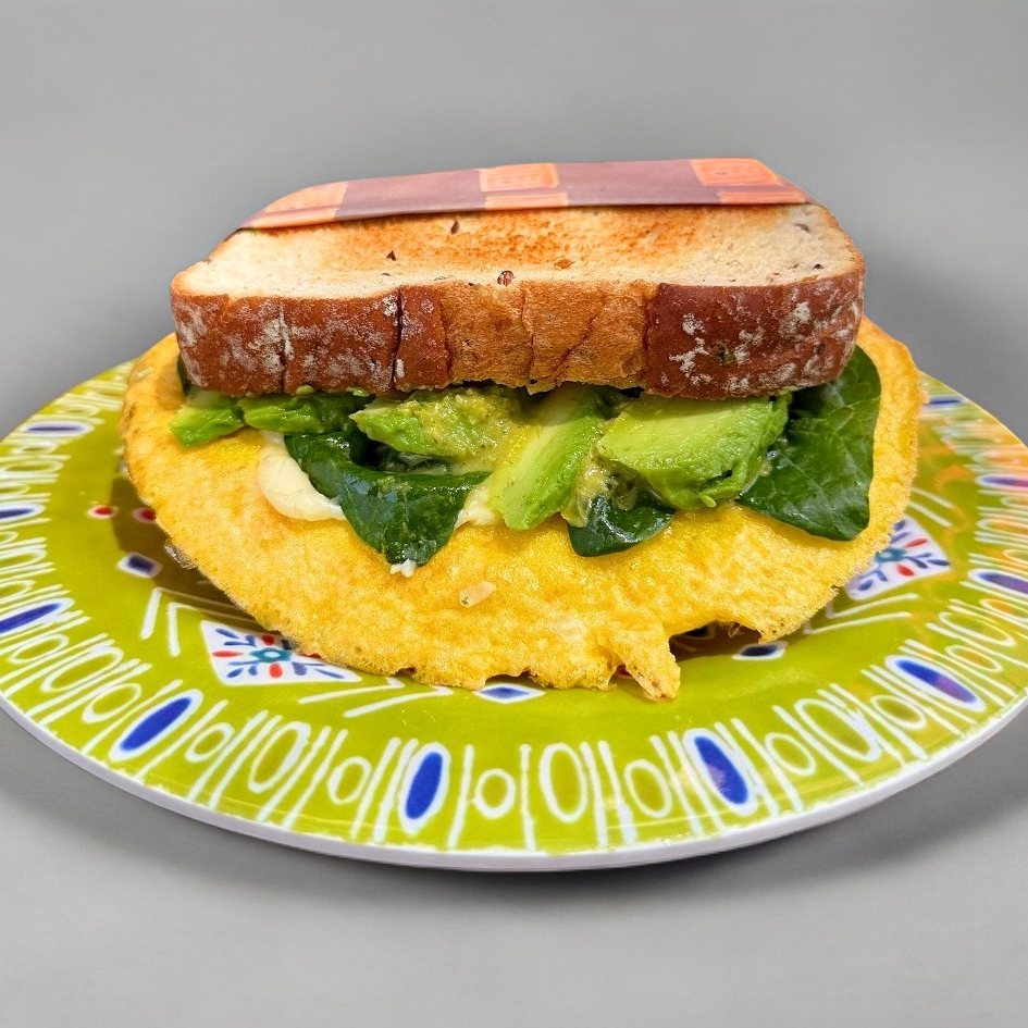 Pan Multigrano tostado / Tortita de huevo / Queso manchego / Espinaca / Aguacate / Salsa Verde (hecha con el amor de mamá)