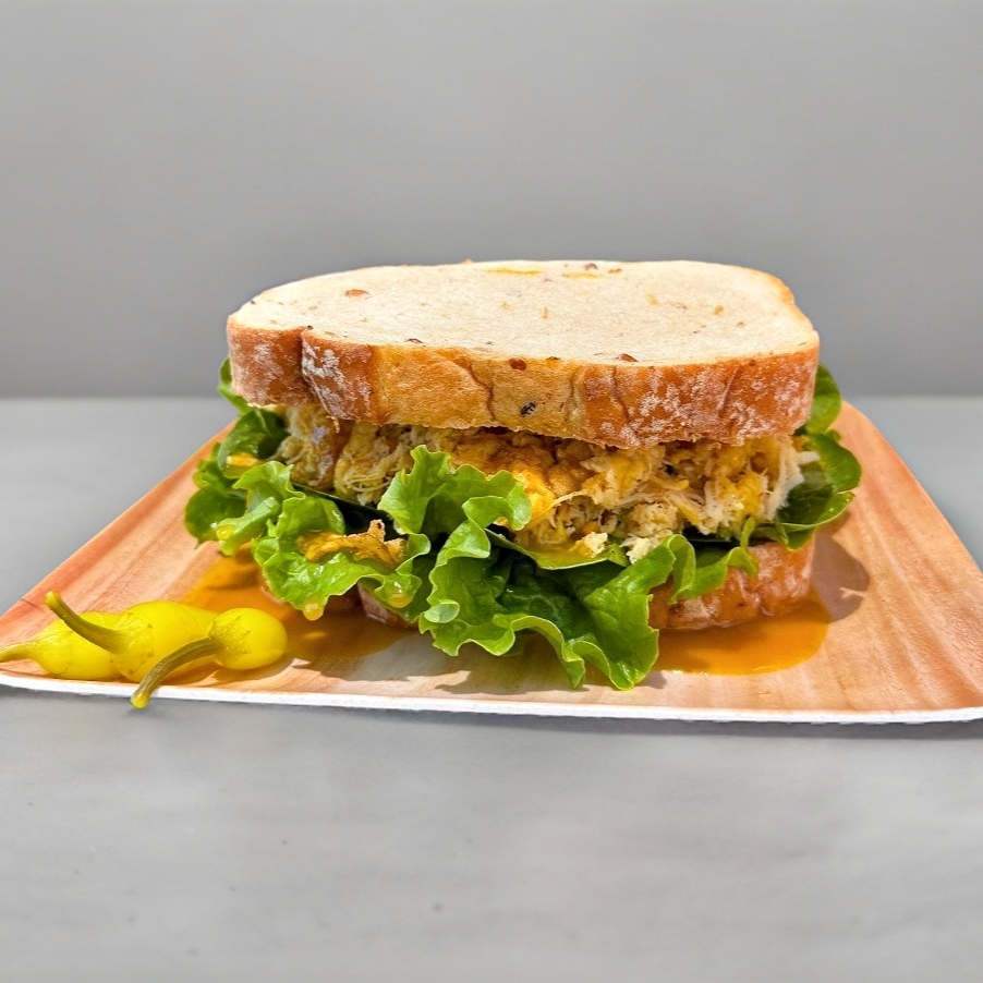 (Pan Multigrano) Pollo sazonado / lechuga / espinaca / hojuelas crujietes de cebolla / aderezo dulce / mostaza / miel / aceite de olivo / toque de habanero
