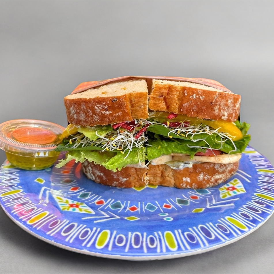 (Pan Multigrano) Dip de yogurt griego espinaca y kale / champiñón / lechuga / tomate / alfalfa / aguacate / morrón / crijientes de betabel / aderezo pesto