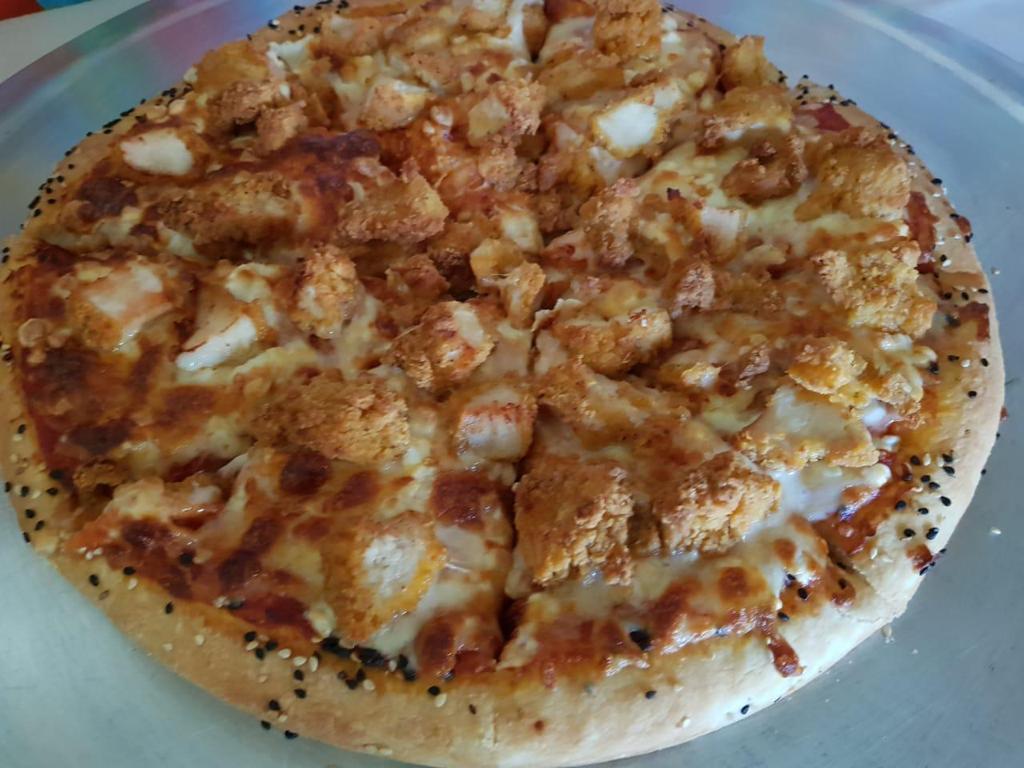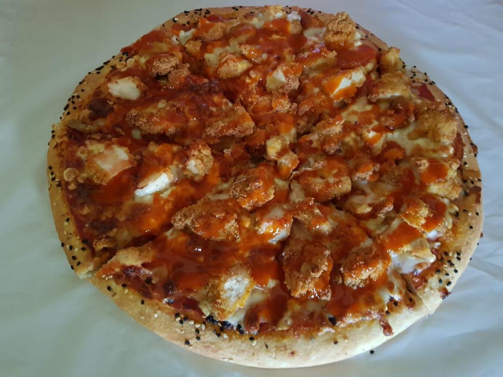 Salsa de tomate, queso mozzarella, boneless bañados en salsa Bbq