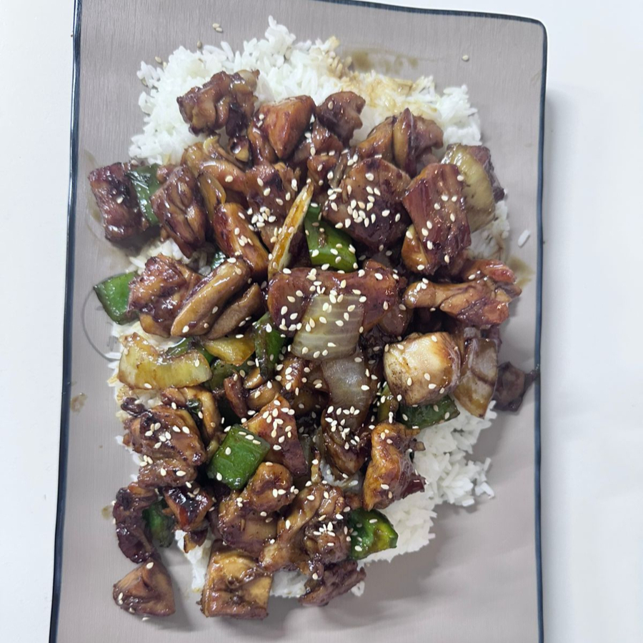 Arroz blanco con pollo bañado en salsa teriyaki