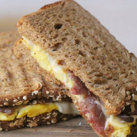 PAN INTEGRAL, 2 HUEVOS EN TORTA, TOCINO Y QUESO RAYADO