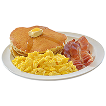 2 HUEVOS REVUELTOS, TOCINO, 2 HOTCAKES INTEGRALES ACOMPAÑADOS DE LECHERA O MIEL A ELEGIR.