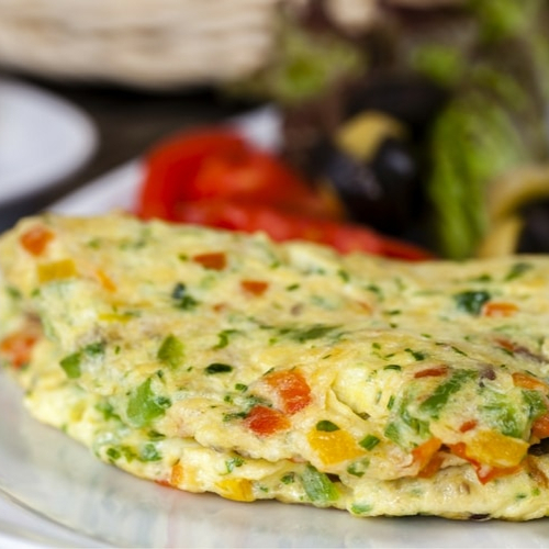 OMELETTE DE QUESO CON 2 HUEVOS, VERDURAS Y PAN TOSTADO.