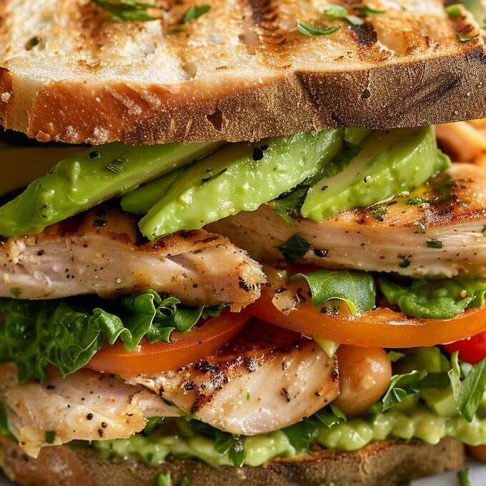 PAN TOSTADO INTEGRAL, POLLO MARINADO, VEGETALES Y AGUACATE
